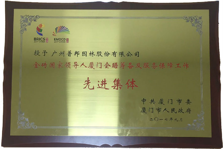 11月10日,福建省人民政府、廈門市委市政府對在9月3日金磚國家領導人廈門會晤籌備及服務保障工作過程中表現(xiàn)突出的先進集體和個人給予通報表揚。我司作為金磚國家領導人廈門會晤基礎設施建設籌備和服務保障工作的重要參建單位,憑借對景觀高標準、高質量的追求,榮獲由中共廈門市委、廈門市人民政府頒發(fā)的“金磚國家領導人廈門會晤籌備及服務保障工作先進集體”的榮譽稱號。此前也屢獲各級政府的高度贊揚,并收到來自代建單位廈門建發(fā)集團有限公司的感謝信。