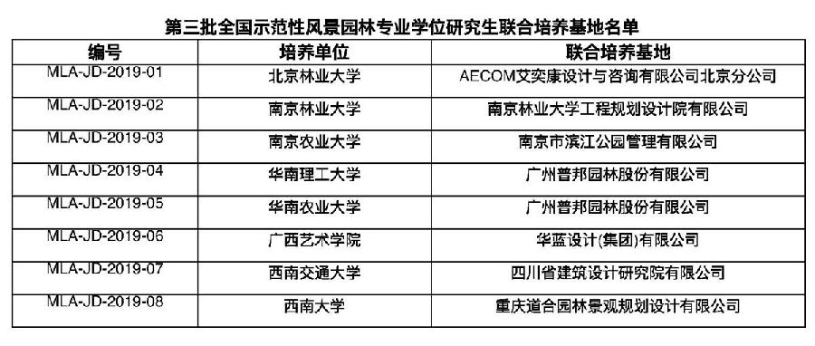 11月16日,第三批“全國示范性風(fēng)景園林專業(yè)學(xué)位研究生聯(lián)合培養(yǎng)基地”授牌儀式在2019中國風(fēng)景園林教育大會閉幕式上舉行。經(jīng)培養(yǎng)單位申報、專家現(xiàn)場評審和全國風(fēng)景園林專業(yè)學(xué)位研究生教育指導(dǎo)委員會全體委員審議,共8家培養(yǎng)單位獲批第三批“全國風(fēng)景園林專業(yè)學(xué)位研究生聯(lián)合培養(yǎng)基地”稱號,我司分別與華南理工大學(xué)、華南農(nóng)業(yè)大學(xué)聯(lián)合獲批“研究生聯(lián)合培養(yǎng)基地”稱號。閉幕會上,教指委為我司與華南理工大學(xué)和華南農(nóng)業(yè)大學(xué)共同授牌。