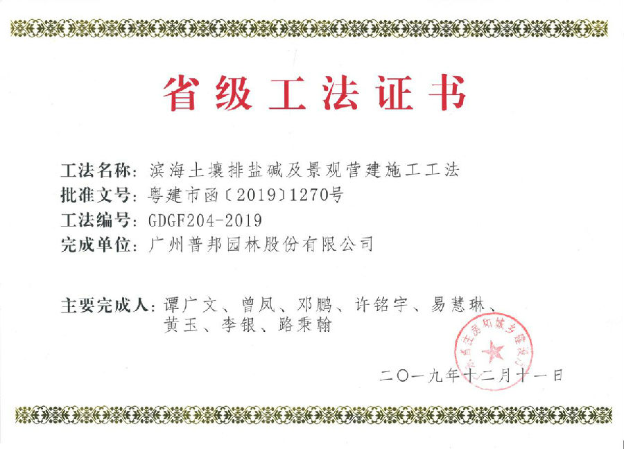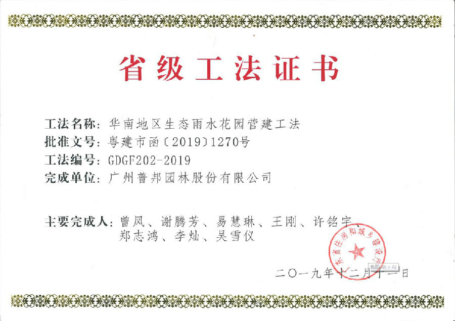 近日,我司收到廣東省住房和城鄉(xiāng)建設廳頒發(fā)的《華南地區(qū)生態(tài)雨水花園營建工法》(GDGF202-2019)、《華南地區(qū)輕型屋頂綠化營建工法》(GDGF203-2019)、《濱海土壤排鹽堿及景觀營建施工工法》(GDGF204-2019),這是我司在海綿型綠地建設技術和濱海景觀生態(tài)修復實踐取得的重要成果。