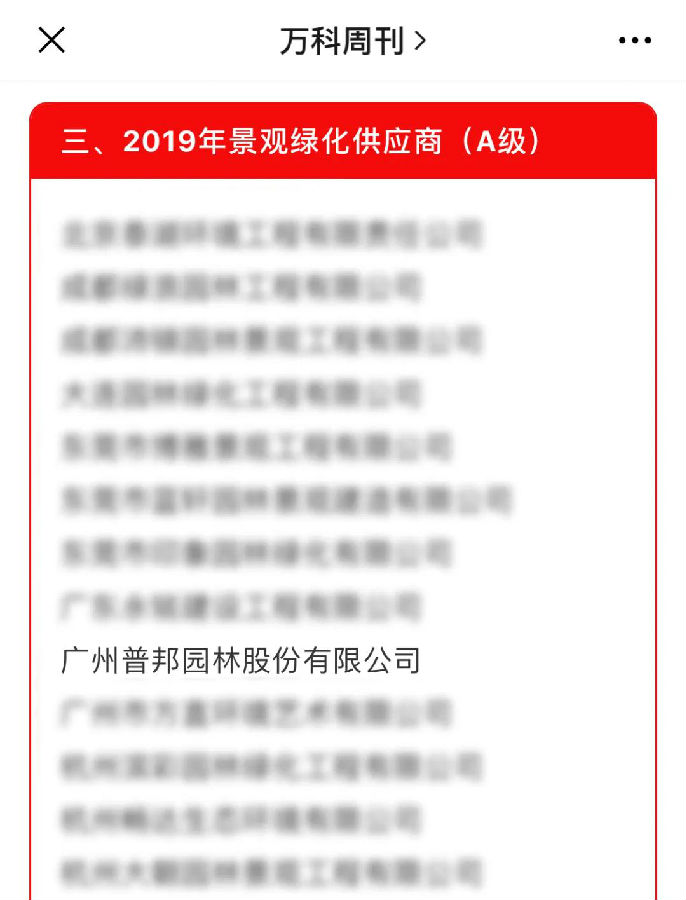 2月12日,萬科集團(tuán)發(fā)布了《萬科2019年度合格供應(yīng)商名錄》,我司憑借優(yōu)質(zhì)專業(yè)的服務(wù),從眾多供應(yīng)商中脫穎而出,入選景觀綠化類供應(yīng)商A級(jí)(最高等級(jí))。此次參評(píng)供應(yīng)商共計(jì)1500余家,獲得“A級(jí)供應(yīng)商”稱號(hào)的入選率僅為16%。此次入選,不僅代表萬科集團(tuán)對(duì)我司專業(yè)水平的充分認(rèn)可,更是對(duì)我司承接萬科業(yè)務(wù)團(tuán)隊(duì)和項(xiàng)目組辛勤耕耘的最好激勵(lì)。