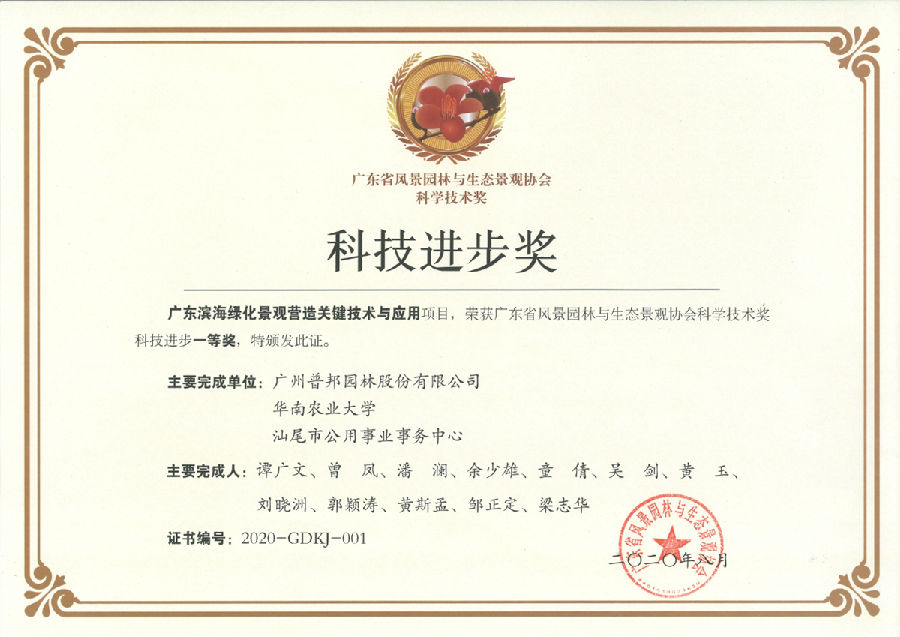 近日,廣東省風景園林與生態(tài)景觀協(xié)會公布了首屆廣東省風景園林與生態(tài)景觀協(xié)會科學技術獎(科技進步獎)評審結果,其中獲獎項目一等獎1項、二等獎6項、三等獎24項;由我司與華南農業(yè)大學等單位合作完成的《廣東濱海綠化景觀關鍵技術與應用》項目,榮獲科技進步唯一的一等獎。